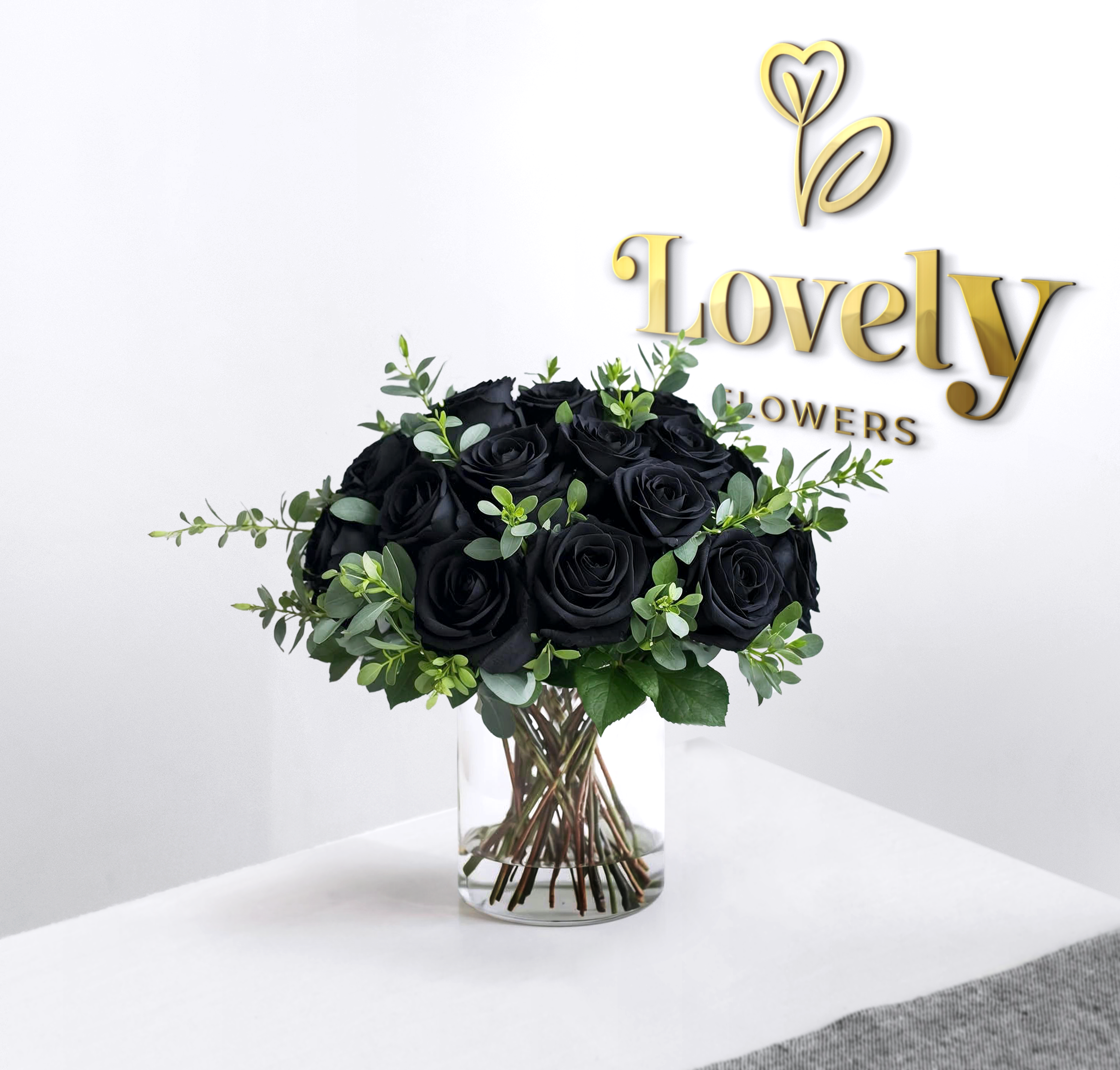 Exquisite black rose bouquet beautifully arranged with fresh greenery in a modern glass vase. A bold and sophisticated floral design perfect for luxury gifts, romantic surprises, anniversaries, or exclusive events. Order premium black roses with same-day flower delivery and make a dramatic statement.