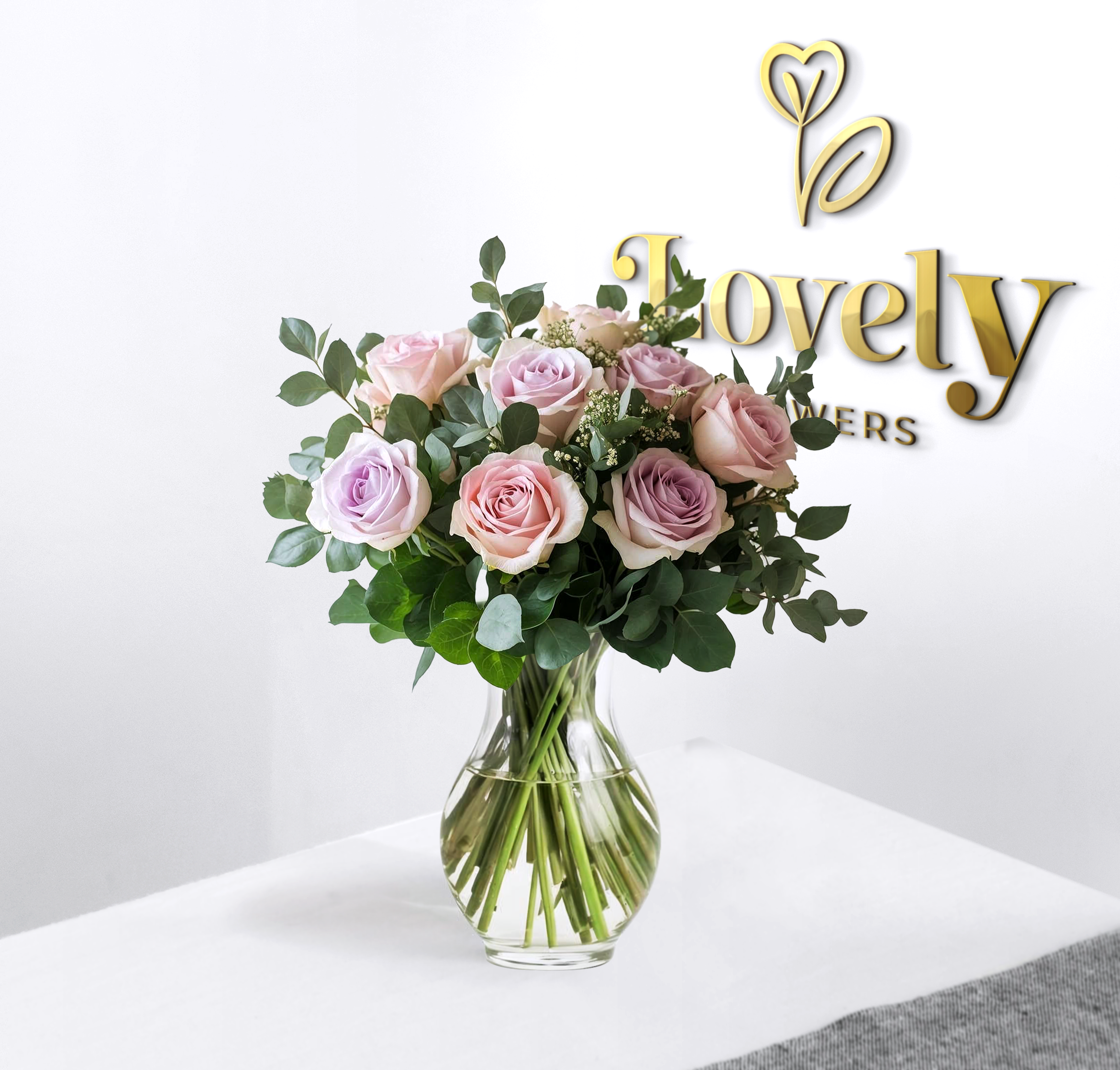 The Fresh Romance Luxe arrangement showcases a stunning blend of premium fresh-cut blush and lavender roses, arranged by hand to create a romantic and luxurious presentation. Designed by Lovely Flowers artisans, this bouquet features lush eucalyptus and a modern glass vase for an elegant, high-end look.