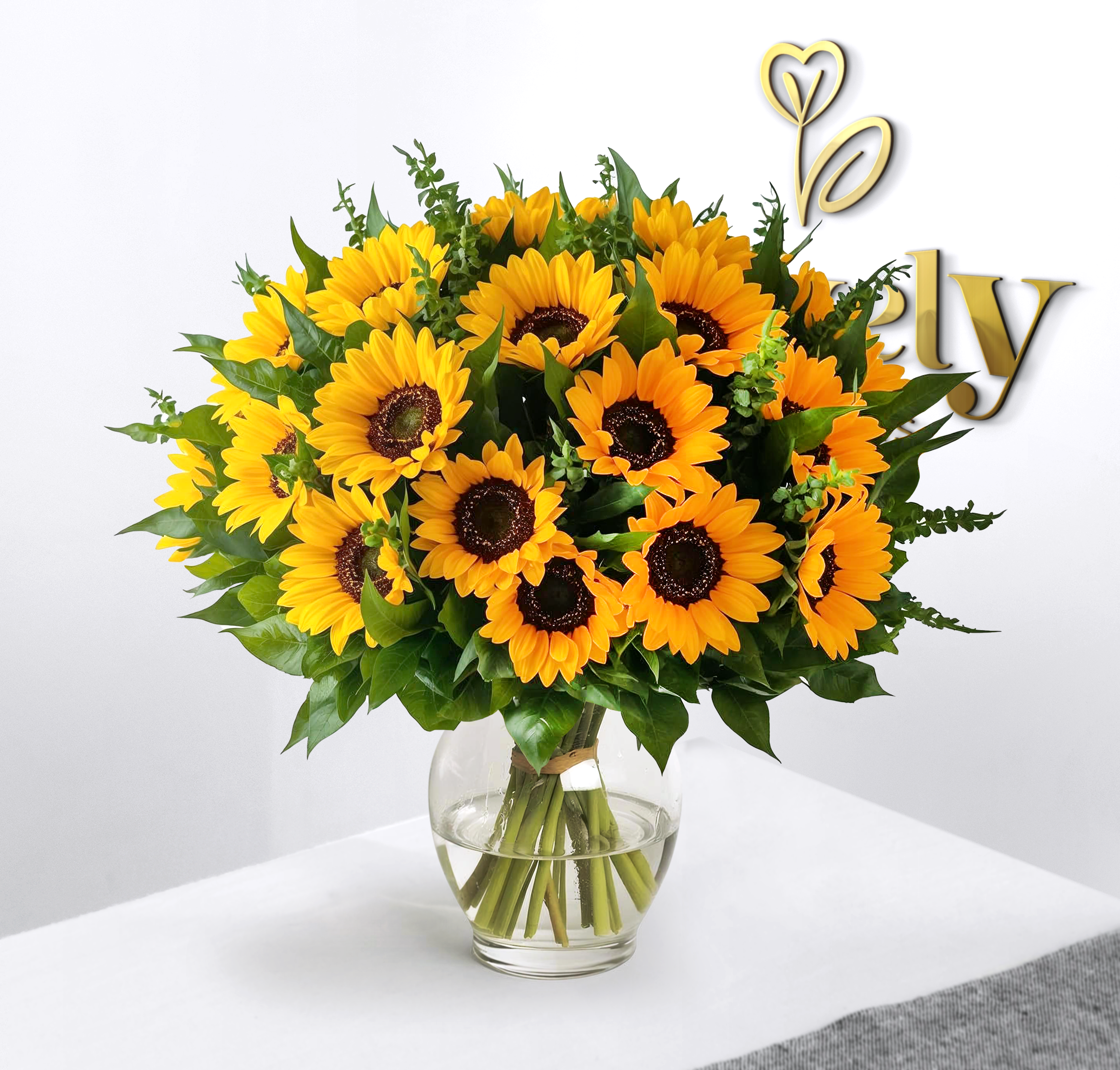 Brighten someone’s day with our Sunshine XL Bouquet, a stunning arrangement of premium fresh-cut sunflowers designed to fill any space with warmth and joy. This large sunflower bouquet is handcrafted by our Lovely Flowers designers using vibrant yellow sunflowers, lush greenery, and a modern clear-glass vase.