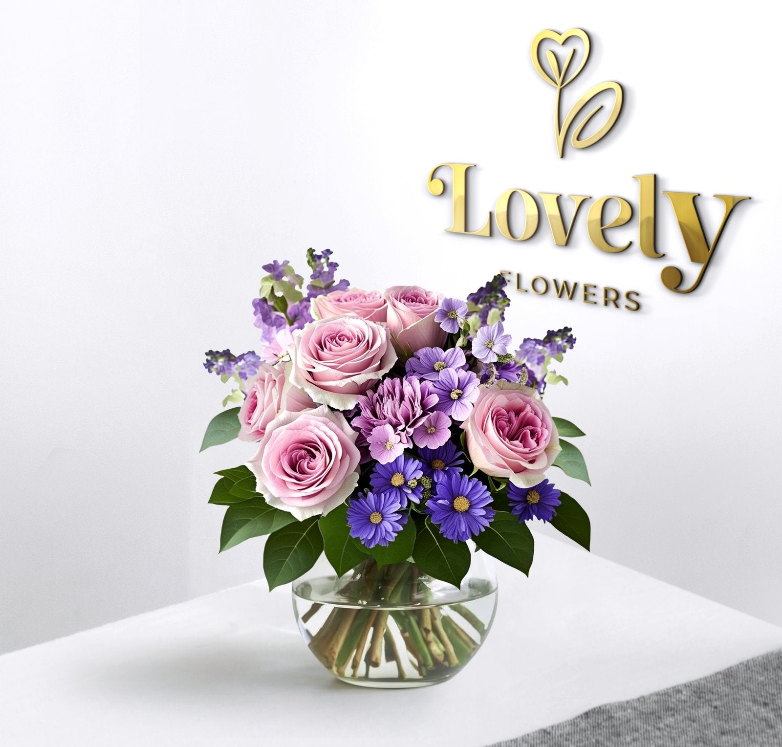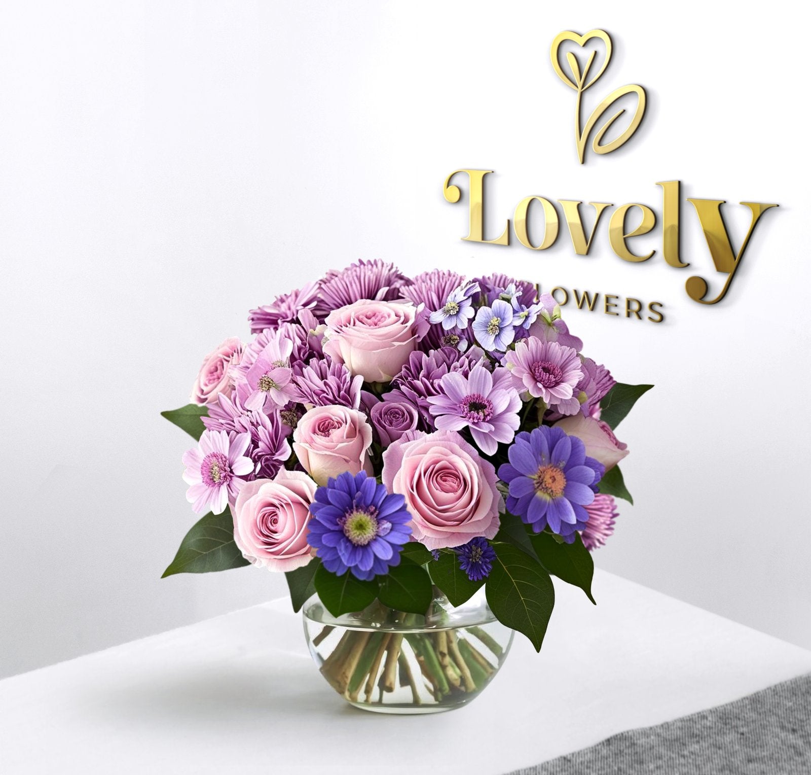 Indulge in the soft charm of our Lovely Lavender Dream Bouquet — a breathtaking blend of elegance and grace. This exquisite arrangement features delicate pink roses, lush lavender chrysanthemums, and vibrant purple asters, perfectly accented with fresh greenery. Presented in a clear glass vase, it’s a radiant expression of love, admiration, and sophistication.